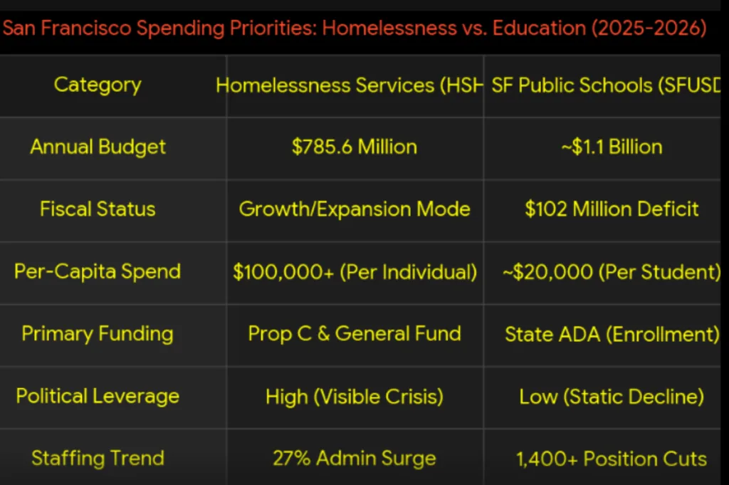 One of the most glaring Universal Truths of this standoff is the Principle of Priority Distortion, which sees the city of San Francisco allocating over $785 million to a homelessness response system while the school district is forced to gut middle school health programs. This Misallocation of Municipal Capital creates a zero-sum game where the “Homelessness Industrial Complex” siphons off the General Fund dollars that could otherwise prevent a catastrophic school shutdown.